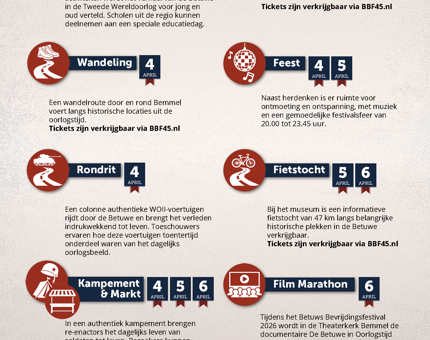 - Op zaterdag 4 april worden verschillende georganiseerde wandelingen aangeboden, waaronder de eerder ontwikkelde podwalk ‘Betuwe in Oorlogstijd’. Deze wandelingen maken deel uit van een wandelprogramma dat bezoekers uitnodigt om de geschiedenis van de regio letterlijk te ervaren in het landschap en de leefomgeving van vandaag.